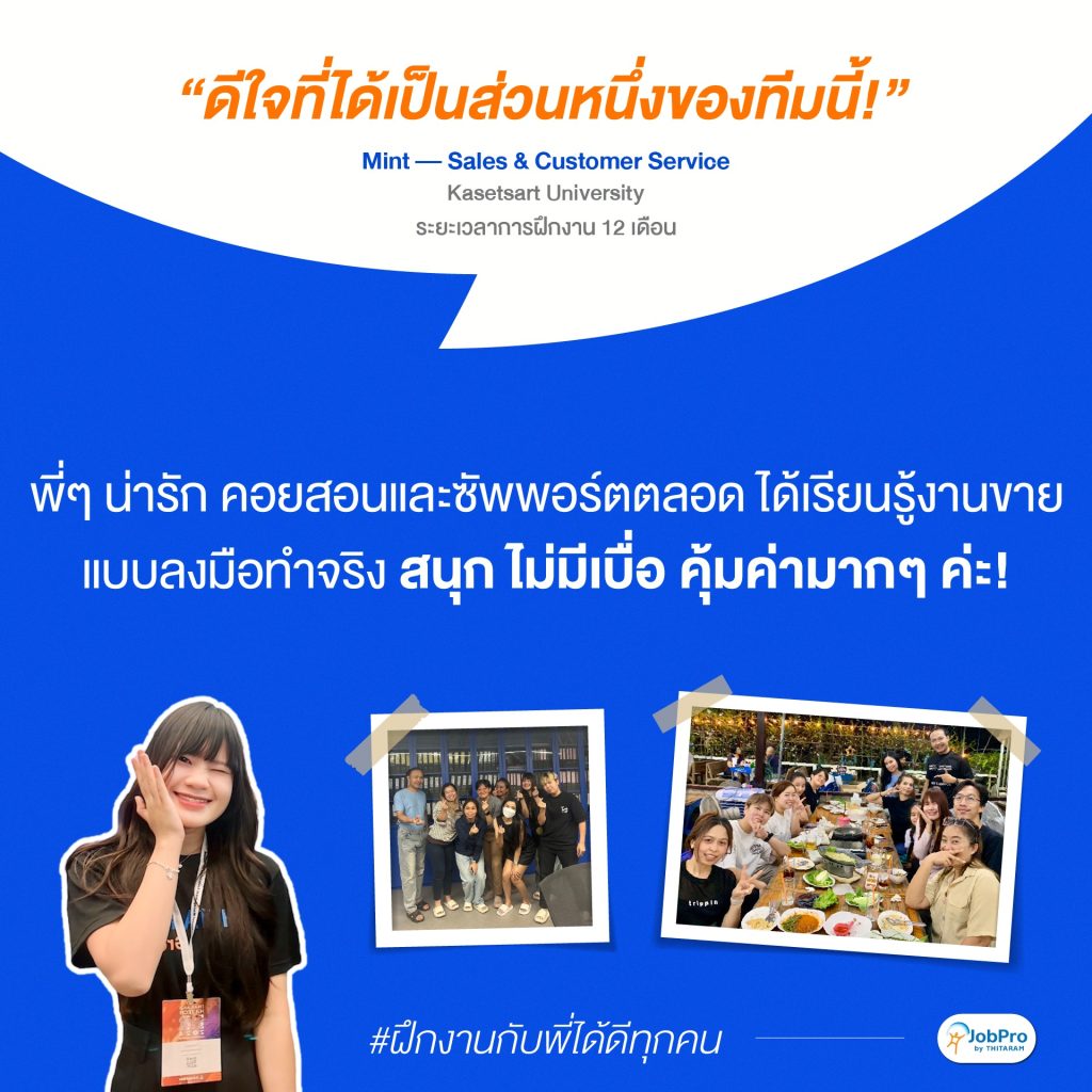 “ดีใจที่ได้เป็นส่วนหนึ่งของทีมนี้! พี่ ๆ น่ารัก คอยสอนและซัพพอร์ตตลอด ได้เรียนรู้งานขายแบบลงมือทำจริง สนุก ไม่เบื่อ คุ้มค่ามาก ๆ ค่ะ! #ฝึกงานกับพี่ๆ ได้ดีทุกคน“