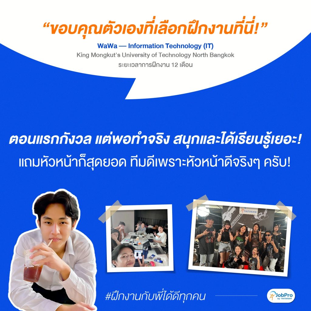 “ขอบคุณตัวเองที่เลือกฝึกงานที่นี่! ตอนแรกกังวล แต่พอทำจริง สนุกและได้เรียนรู้เยอะ! แถมหัวหน้าก็สุดยอด ทีมดีเพราะหัวหน้าดีจริง ๆ ครับ! #ฝึกงานกับพี่ๆ ได้ดีทุกคน“